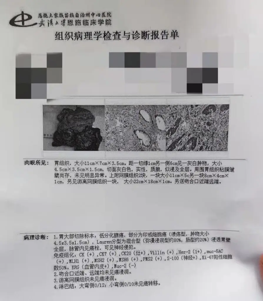 到出院的那一天,报告出来了,结果确实不太好,侵犯胃壁全层了已经,但是非常幸运的是,没!有!淋!巴!结!转!移!哪怕有脉管癌栓和神经侵犯,医生也安慰我说那是切掉的胃组织里的,即使有也不会那么快发生转移,得亏爸治的早。